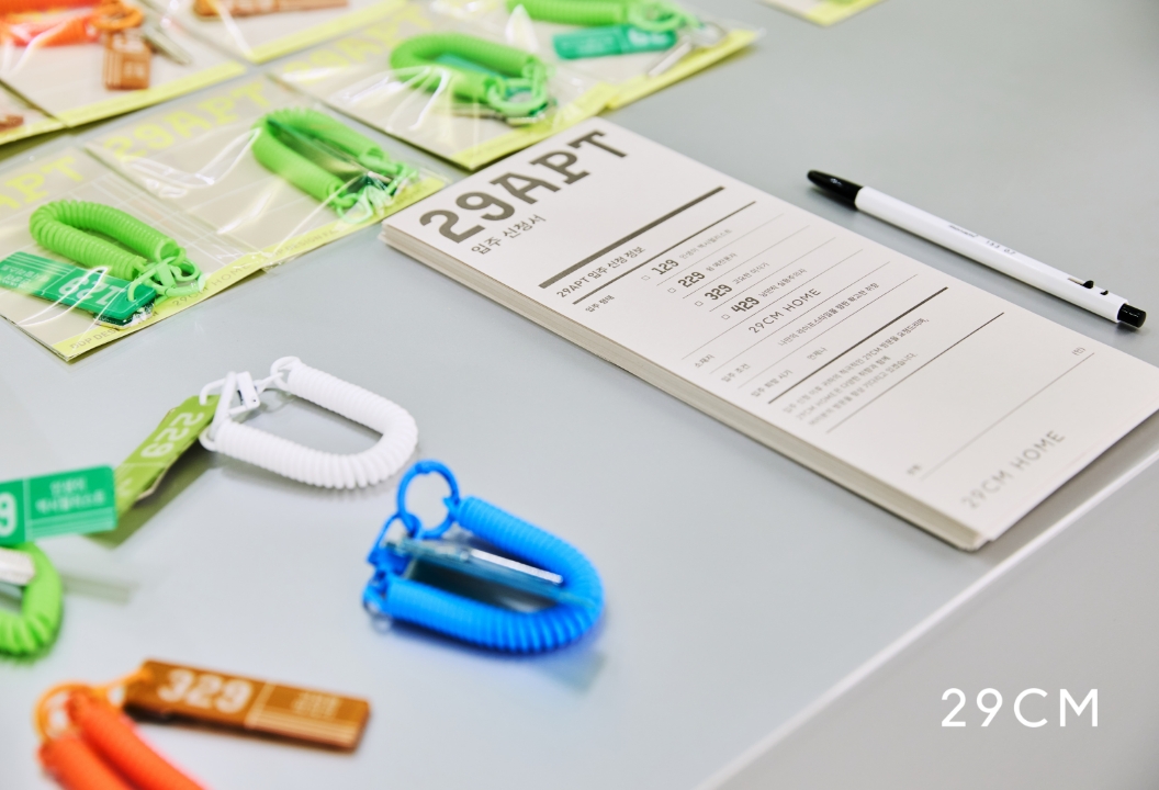 4개의 부스에 '29'로 끝나는 동호수를 붙인 것, 눈치채셨나요? 나의 취향 유형에 맞는 '동호수'를 선택하면 맞춤 열쇠 키링까지 받을 수 있었어요. 눈으로만 보는 전시가 아니라, 손에 잡히는 오브제로 전체 컨셉을 기억할 수 있는 디테일이 인상적이었습니다. (에디터는 429호 키링을 받았습니다🤎) |