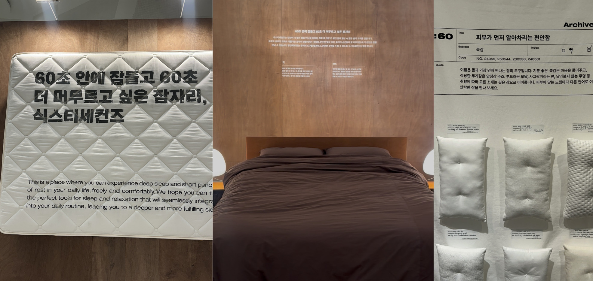 ‘60초 안에 잠들고, 60초 더 머물고 싶은 잠자리’라는 슬로건과 함께 매트리스를 통째로 벽에 붙인 식스티세컨즈(60SECONDS) 부스는 단연 눈에 띄었어요.