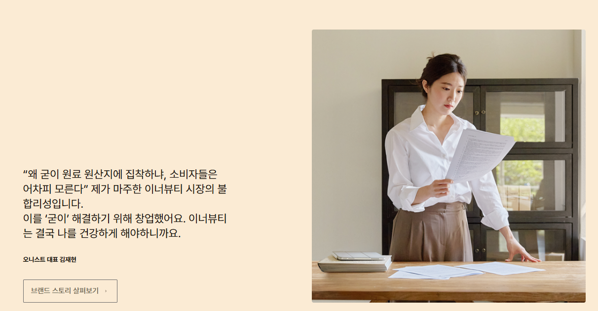 이너뷰티 브랜드답게, 오니스트의 홈페이지는 브랜드 웹사이트의 정석처럼 느껴진 구성이었습니다.