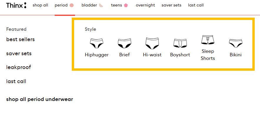 'Hiphugger', 'Brief', 'Hi-waist', 'Sleep Shorts' 등 텍스트만으로는 바로 이해가 되지 않는 스타일을 이미지와 함께 배치해서 혼선을 줄인 것이 인상 깊습니다.