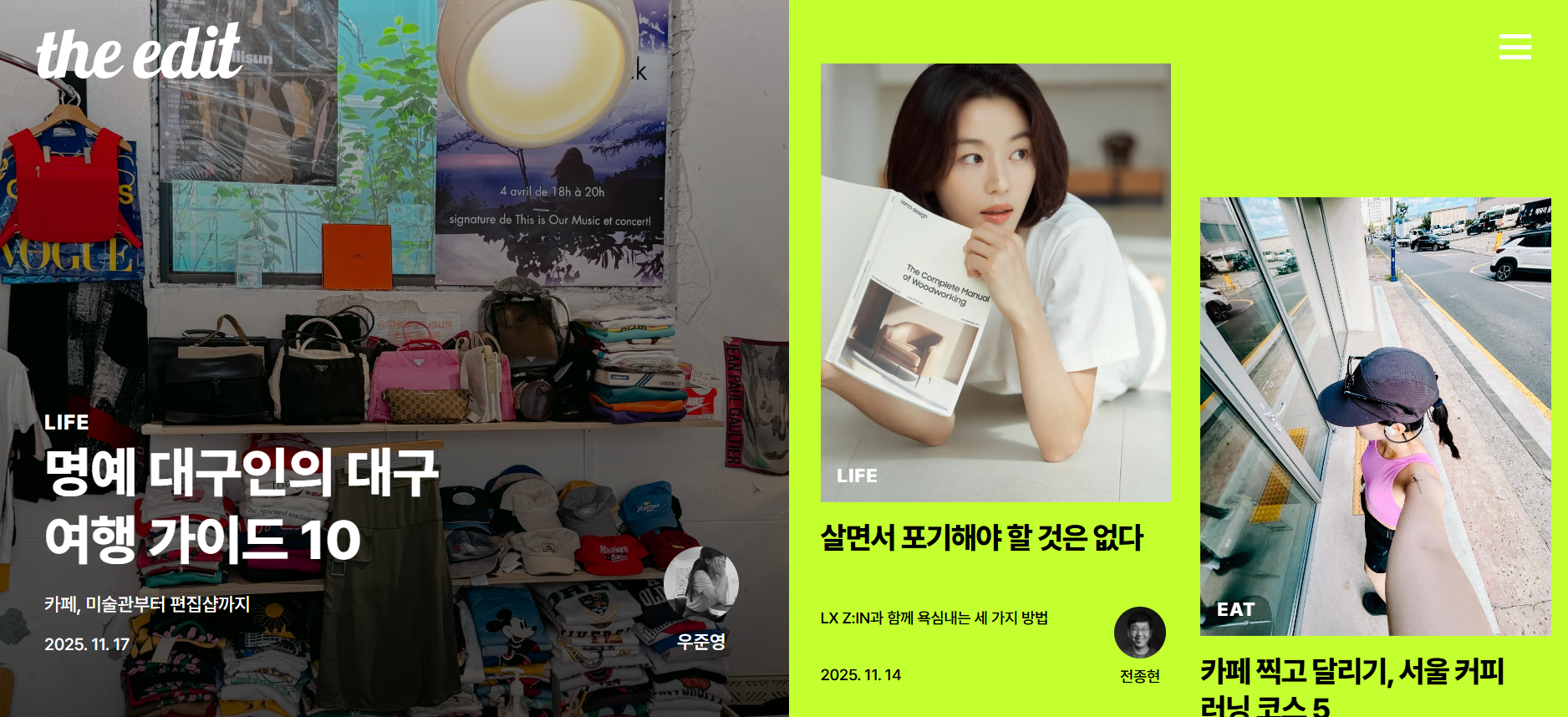 양질의 트렌드를 전달하는 매거진 '디에디트'답게 세련된 홈페이지 구성이 인상 깊습니다. Life, Tech, Eat 등 다채로운 아티클 주제는 물론, 클릭을 부르는 ‘매력적인 카피라이팅’까지.