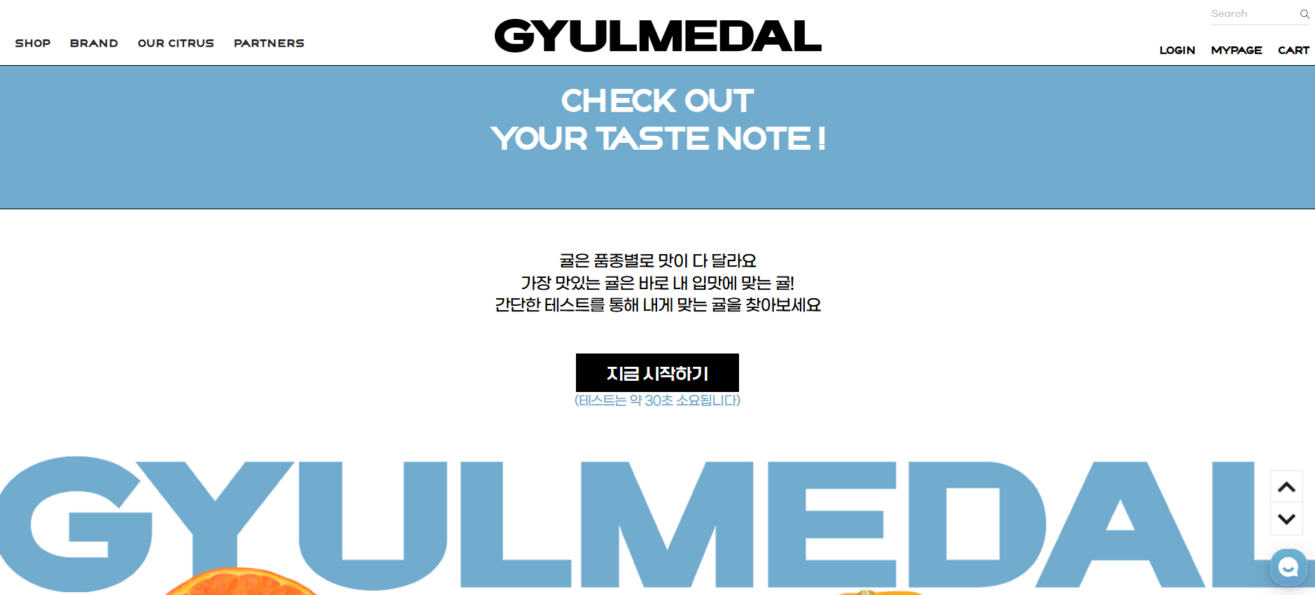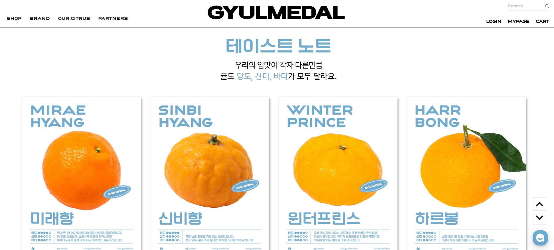 귤도 당도, 산미, 바디가 다르다니. 귤의 '테이스트 노트'를 보여주는 곳은 처음인데요. 전체적인 웹사이트의 구성에서 귤의 상큼함과 통통 튀는 에너지가 잘 느껴졌어요. |